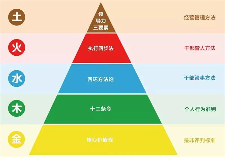 “金”代表核心价值观:是非评判标准;“木”代表十二条令:个人行为准则;“水”代表四环方法论:干部管事方法;“火”代表执行四步法:干部管人方法;“土”代表领导力三要素:经营管理方法。